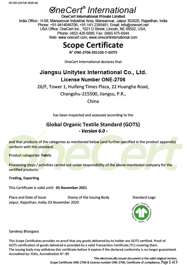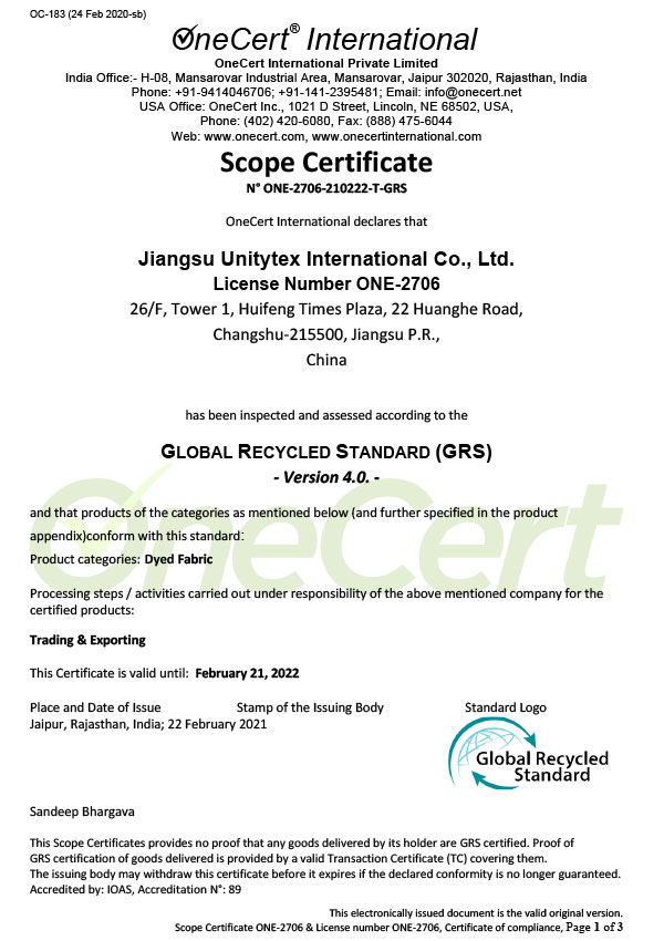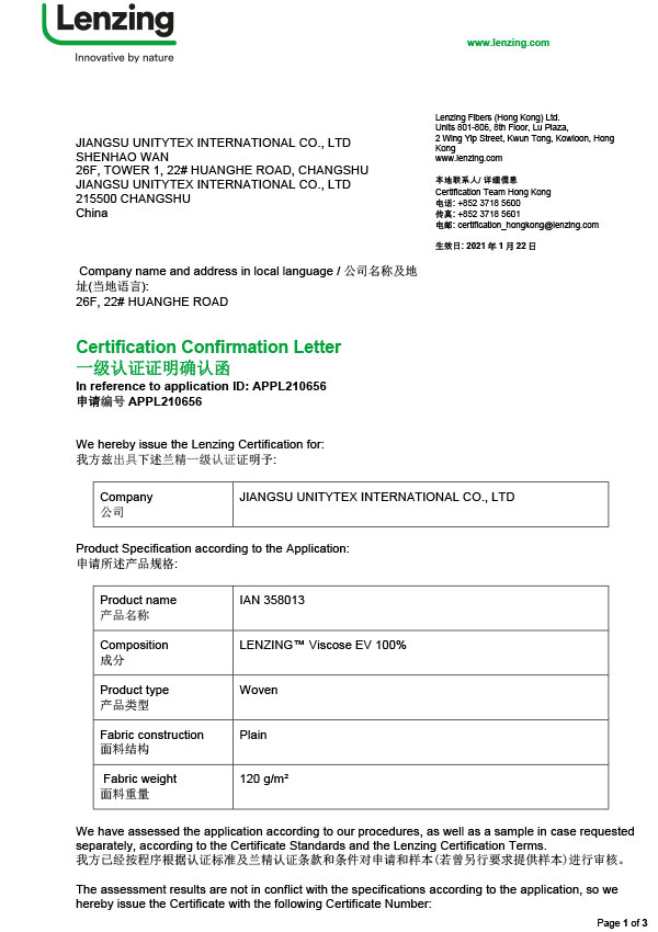 Jiangsu Unitytex International Co., Limited established in 2014, is a professional textile exporter focused on sustainable material to make eco-friendly fabrics and aim to be a one-stop fabric supply chain for ready-make garment manufacturers. Our main products are both Woven and Knitting fabrics with Rayon Viscose (EcoVero) , cotton ( Organic Cotton), recycled polyester(GRS), Cotton/Rayon blended, Rayon/Poly blended, Rayon/Nylon Blended, with and without spandex(Lycra) etc.